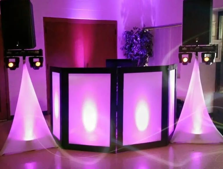 DJ BOOTH SCRIM TO MATCH YOUR EVENT (BLACK , WHITE , RUSTIC WOOD.